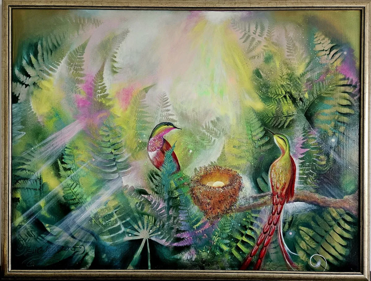 La Belle Vert is a dynamic exploration of organic motion and vibrant energy, rendered through a bold palette dominated by lush greens, deep purples, and soft neutrals. At its core, a delicately textured circle anchors the composition, serving as both a focal point and a portal through which the viewer is drawn into a fluid world of abstract forms and layered gestures. Swirls, arcs, and intersecting planes evoke the rhythm of nature and the complexity of inner landscapes. The work balances spontaneity with structure, suggesting themes of growth, transformation, and interconnectedness. Rich textures and contrasting tones create depth, inviting prolonged contemplation and personal interpretation. This piece reflects a harmonious tension between chaos and control, embodying the spirit of "the beautiful green" — a metaphor for vitality, renewal, and the enigmatic beauty of the natural world reimagined through abstraction.