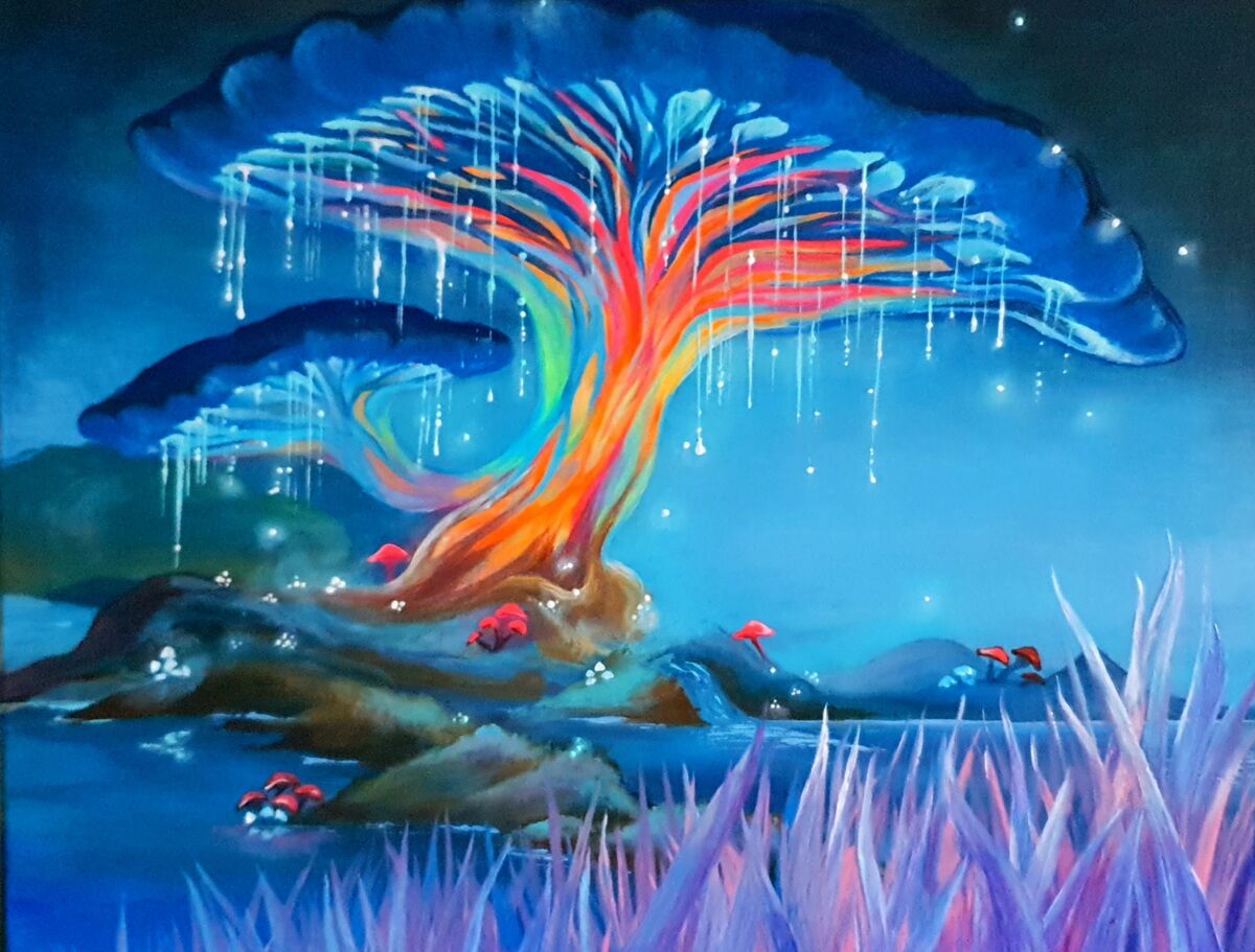 Xamaran is the name of this big wise tree. It is there to protect others, and they all live in a cave. This is inspired from the game Genshin Impact. That is a stretched canvas of 41x51 cm, acrylic.