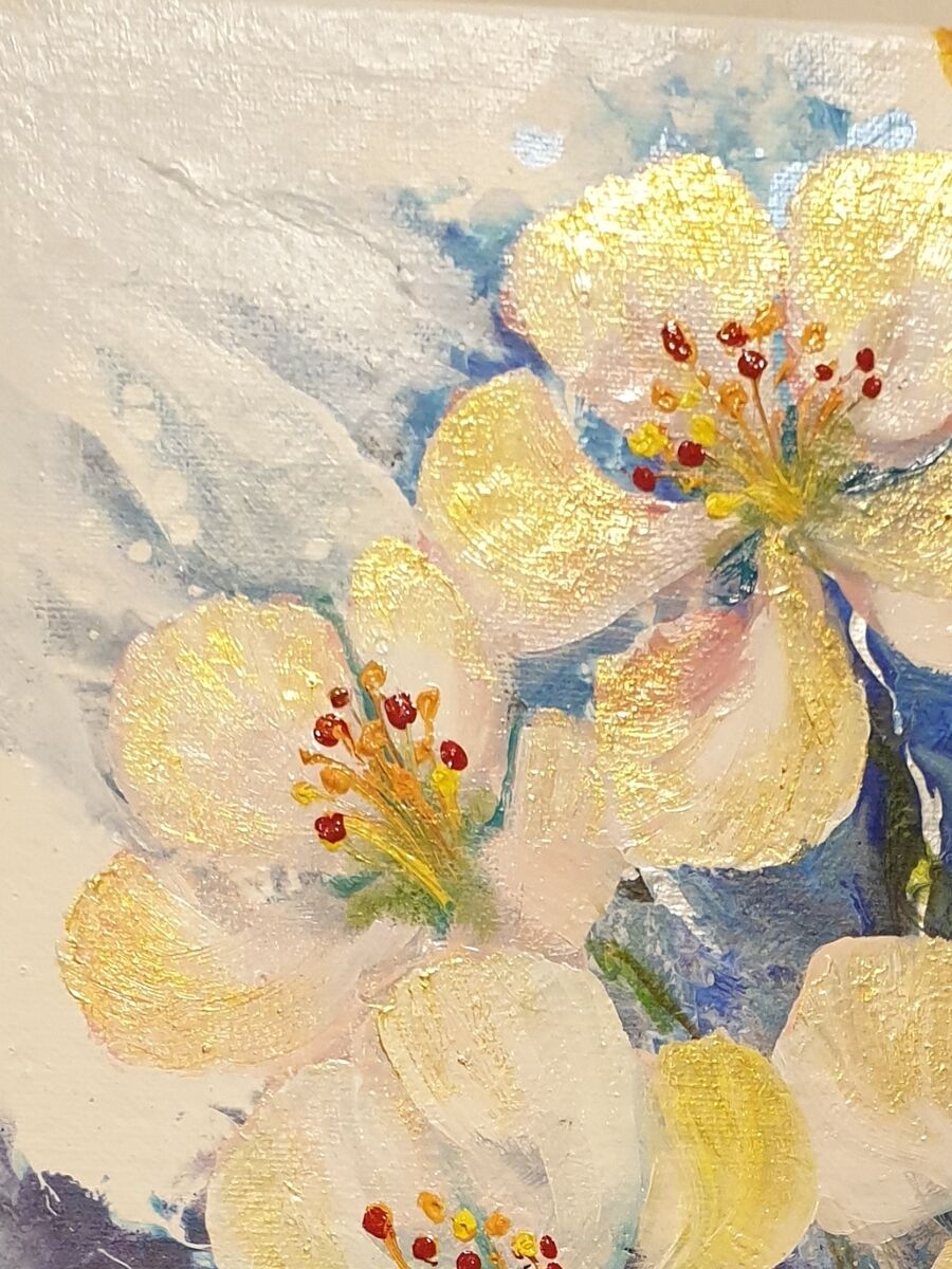 Golden Flowers. Acrylic pouring and Oil painting, coated with gold painting. Stretched canvas of 41x35cm.