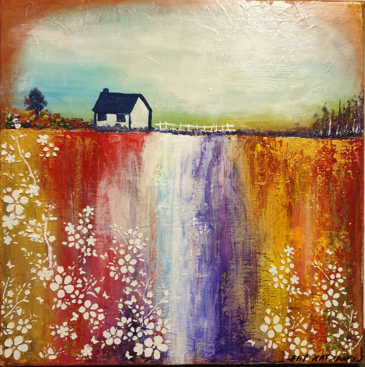 Peacefull Home, I called it. That is acrylic painting, on stretched canvas of 30x30cm. This is a textured painting with fiber paste.