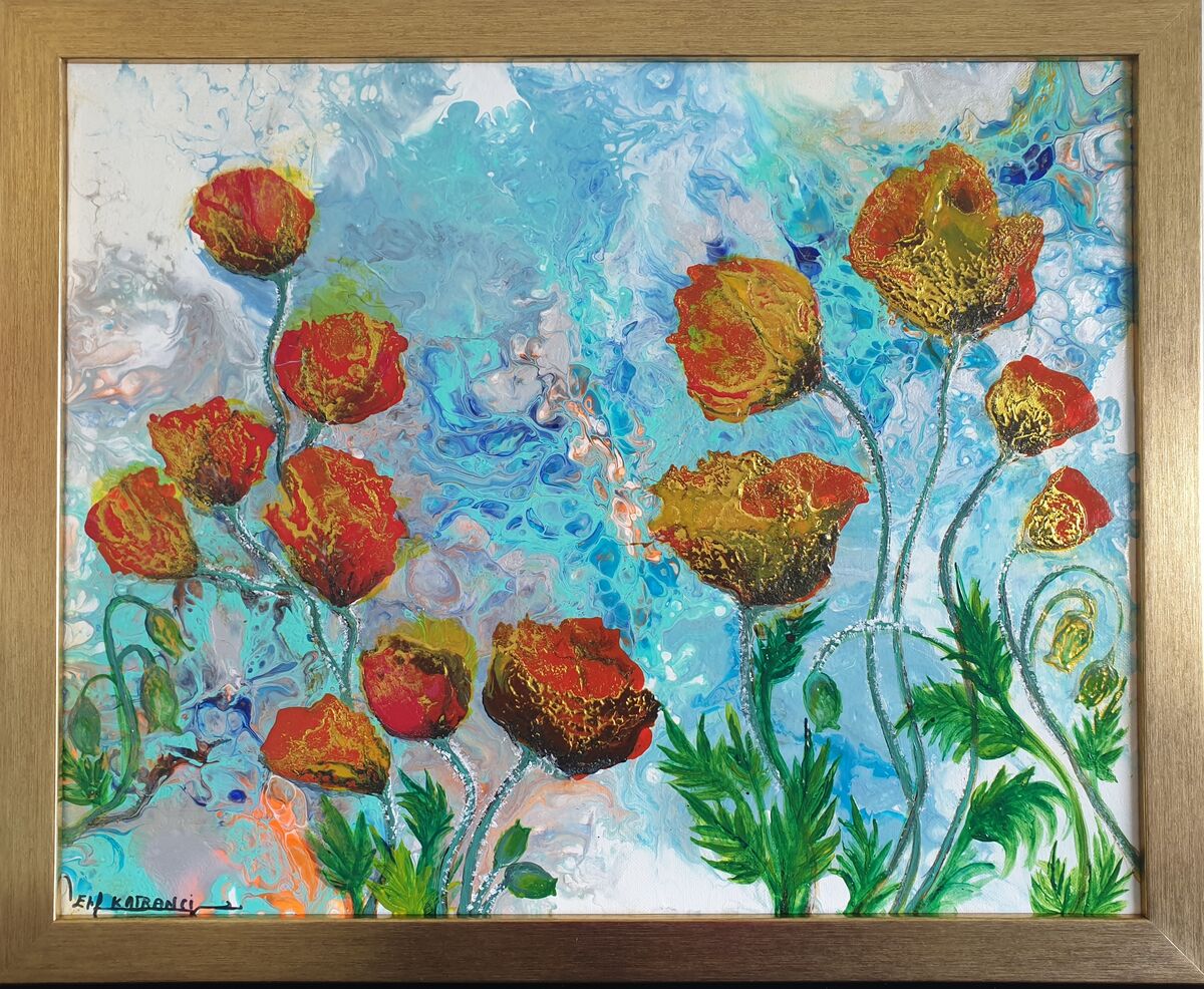 Those red poppies are an invitation for love, passion and dance! That is acrylic on a dutch pouring technique, with ceramic paint, framed stretched canvas, ready to hang.