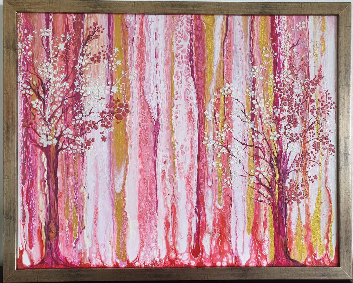 That is acrylic pouring and painting technique. I called it smoking tulips. It is stretched framed canvas of 31x41cm.