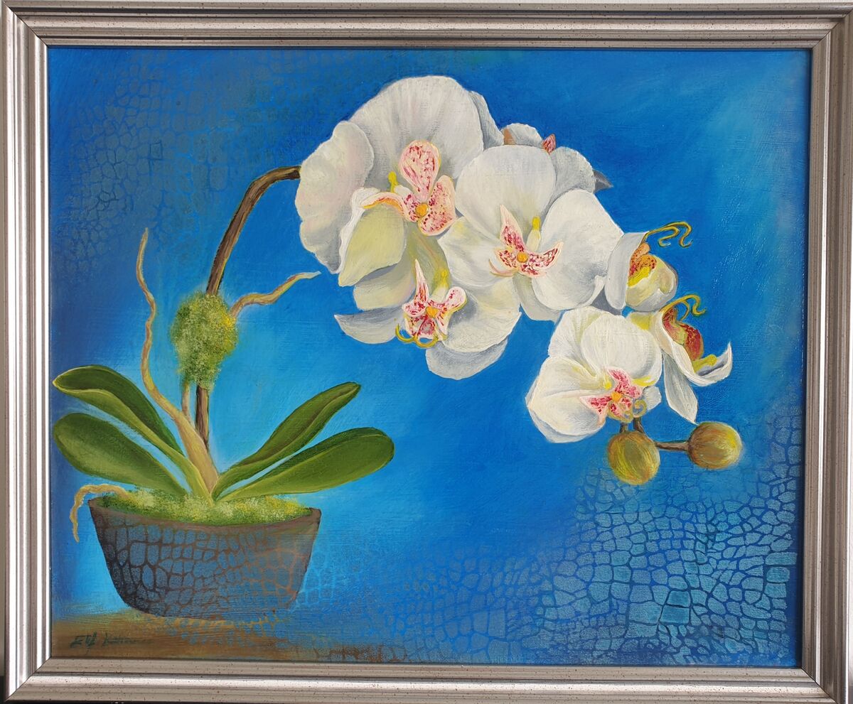 The Birds in the white Orchids. That is oil painting of 41x51cm on a stretched canvas. This is silver coloured framed, with 41x51 cm.