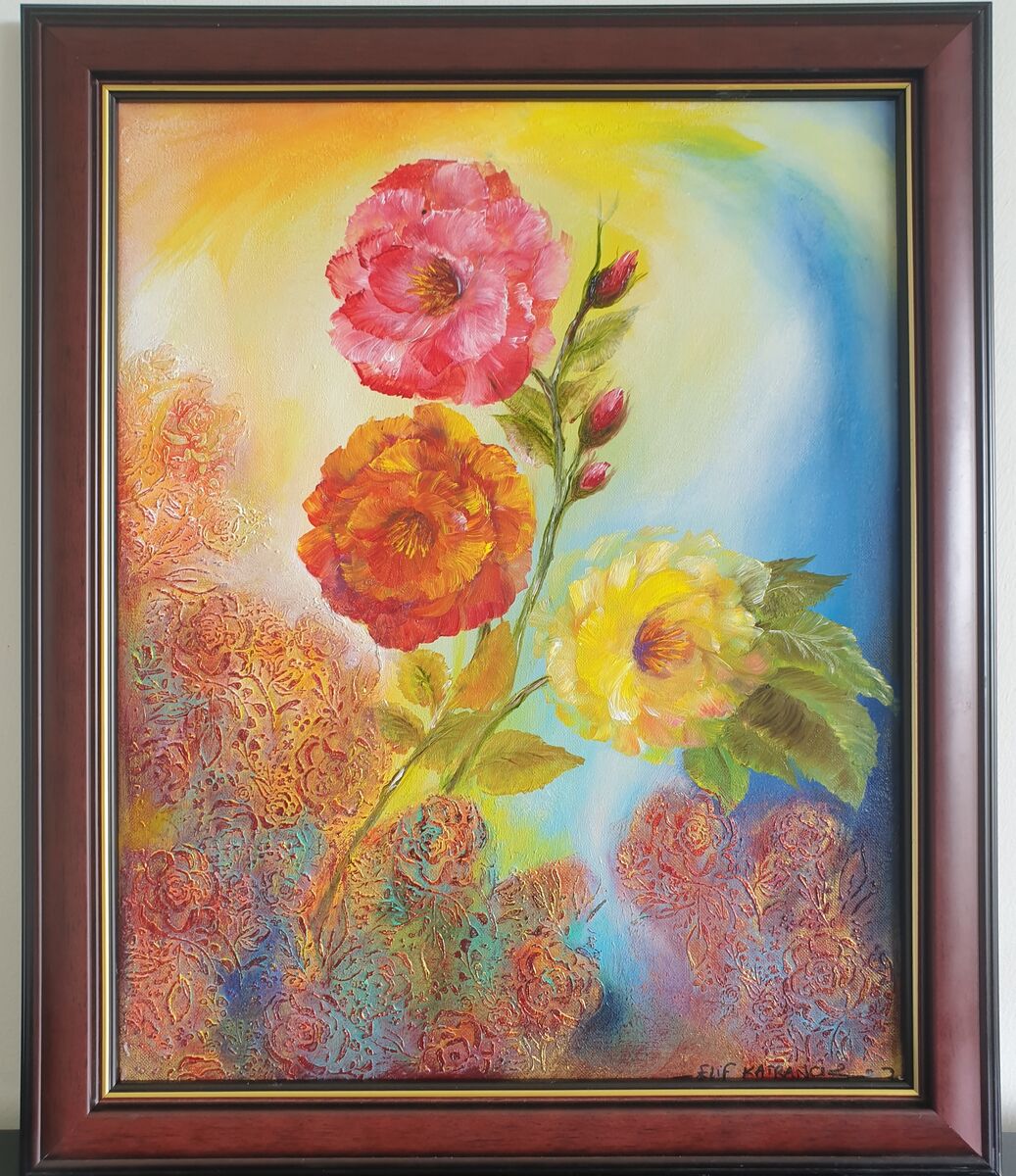 All beauty around us, that is acrylic and oil painting on stretched canvas of 51x59x3cm.