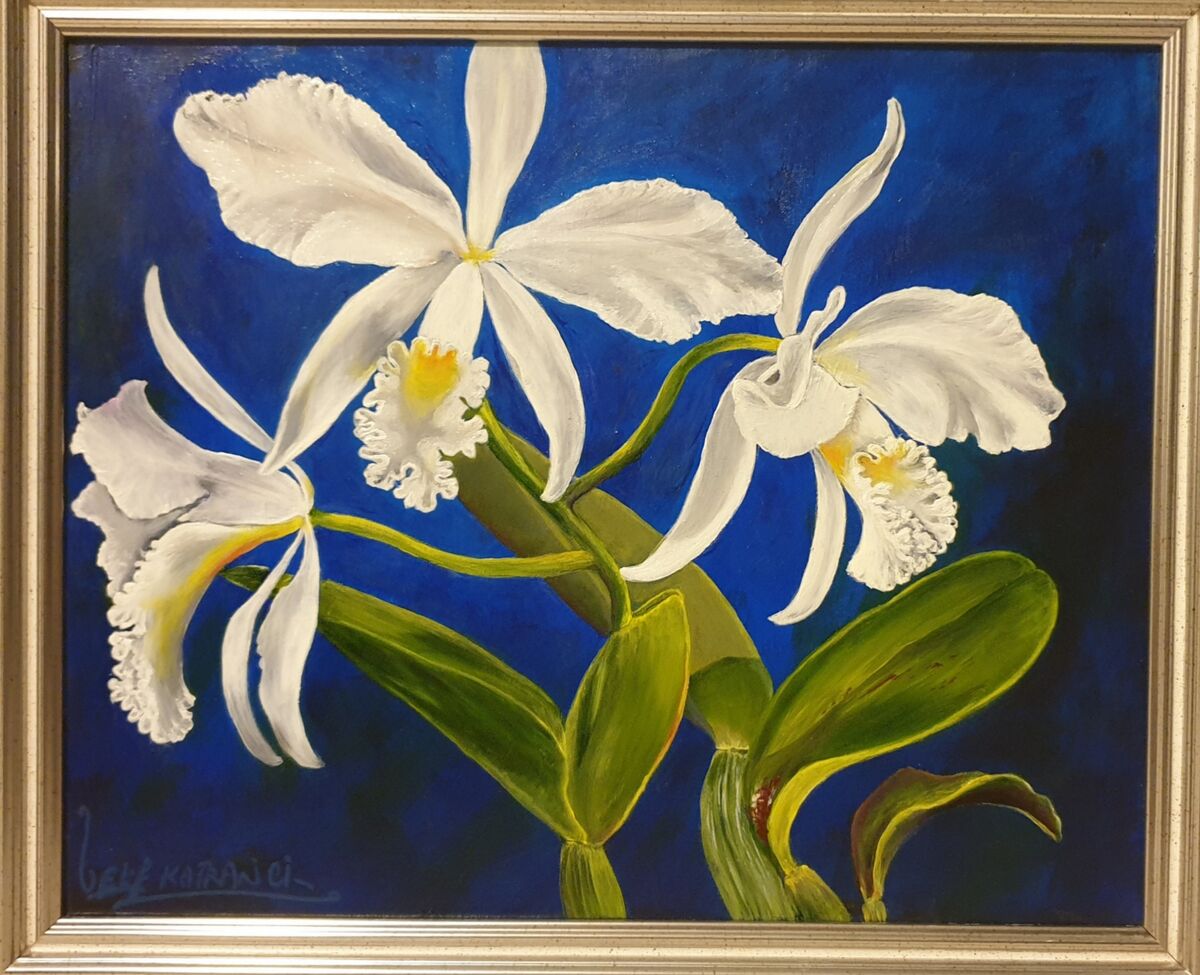 This is part of my Cattleya Orchids Collection. Cattleya Orchid is also called the Queen of the Orchids. That is acrylic and oil painting It is framed, with silver color wood.